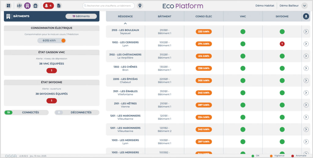 Les données de consommation des logements sont collectées et accessibles sur une plateforme. Cette interface permet de visualiser l’ensemble des métriques par logement, d’identifier les anomalies éventuelles et d’assurer un suivi précis à l’échelle du bâtiment.